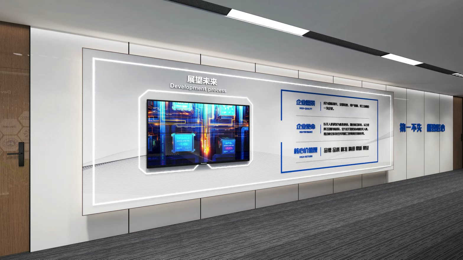 展厅空间面积约为80米,层高2.7米。半闭合展厅与公共空间展示区域相结合,共同打造科技感十足的现代化企业展厅。